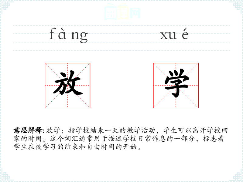 放学:指学校结束一天的教学活动,学生可以离开学校回家的时间。这个词汇通常用于描述学校日常作息的一部分,标志着学生在校学*的结束和自由时间的开始。