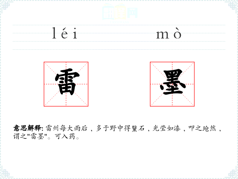雷州每大雨后﹐多于野中得黳石﹐光莹如漆﹐叩之玱然﹐谓之"雷墨"。可入药。