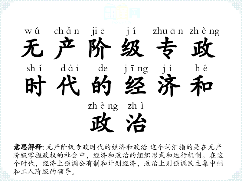 无产阶级专政时代的经济和政治 这个词汇指的是在无产阶级掌握政权的社会中,经济和政治的组织形式和运行机制。在这个时代,经济上强调公有制和计划经济,政治上则强调民主集中制和工人阶级的领导。