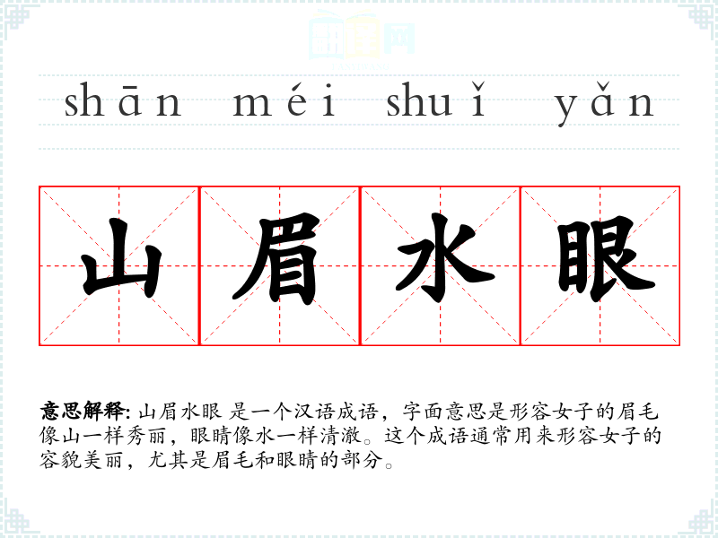 山眉水眼 是一个汉语成语,字面意思是形容女子的眉毛像山一样秀丽,眼睛像水一样清澈。这个成语通常用来形容女子的容貌美丽,尤其是眉毛和眼睛的部分。