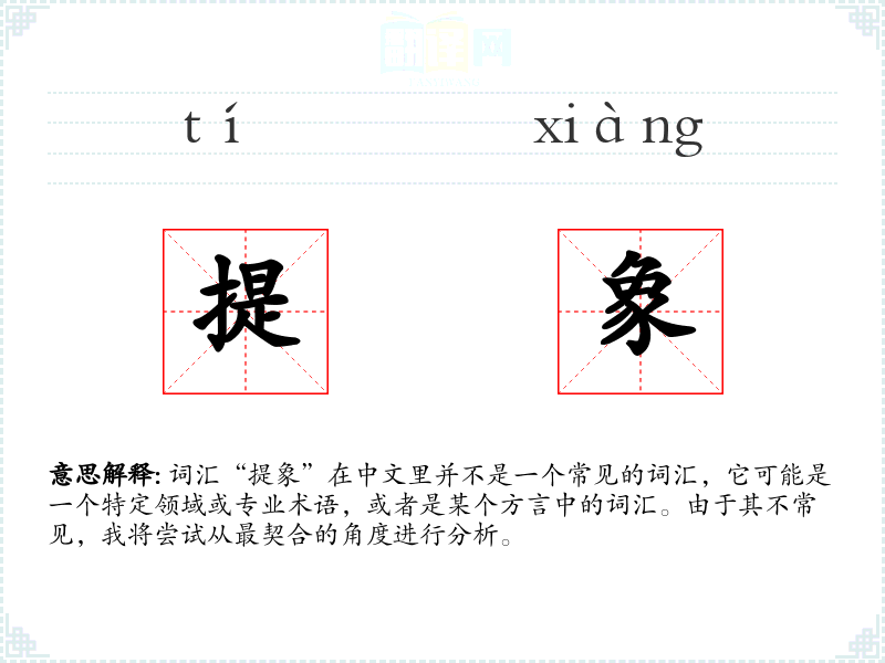 词汇“提象”在中文里并不是一个常见的词汇,它可能是一个特定领域或专业术语,或者是某个方言中的词汇。由于其不常见,我将尝试从最契合的角度进行分析。