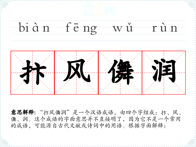 “抃风儛润”是一个汉语成语,由四个字组成:抃、风、儛、润。这个成语的字面意思并不直接明了,因为它不是一个常用的成语,可能源自古代文献或诗词中的用语。根据字面解释: