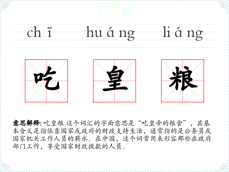 吃皇粮 这个词汇的字面意思是“吃的粮食”,其基本含义是指依靠国家或政府的财政支持生活,通常指的是公务员或国家机关工作人员的薪水。在,这个词常用来形容那些在政府部门工作,享受国家财政拨款的人员。