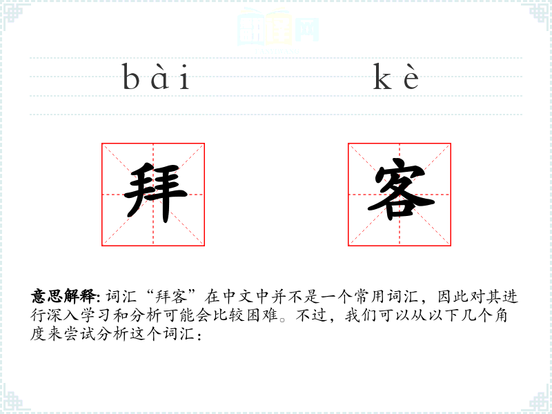 词汇“拜客”在中文中并不是一个常用词汇,因此对其进行深入学*和分析可能会比较困难。不过,我们可以从以下几个角度来尝试分析这个词汇:
