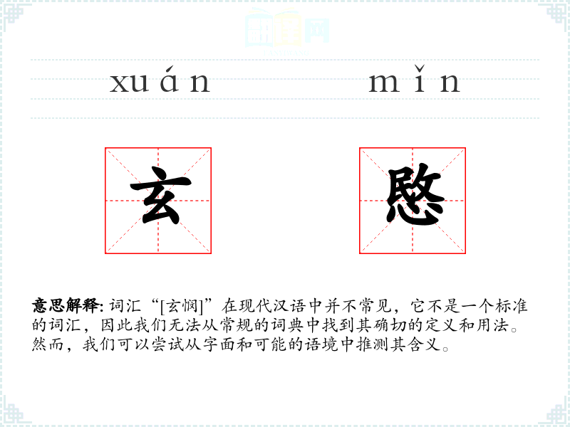 词汇“[玄悯]”在现代汉语中并不常见,它不是一个标准的词汇,因此我们无法从常规的词典中找到其确切的定义和用法。然而,我们可以尝试从字面和可能的语境中推测其含义。
