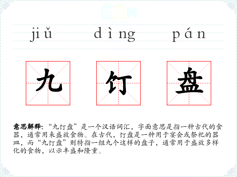 “九饤盘”是一个汉语词汇,字面意思是指一种古代的食器,通常用来盛放食物。在古代,饤盘是一种用于宴会或祭祀的器皿,而“九饤盘”则特指一组九个这样的盘子,通常用于盛放多样化的食物,以示丰盛和隆重。