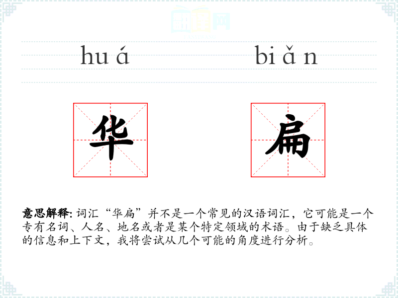词汇“华扁”并不是一个常见的汉语词汇,它可能是一个专有名词、人名、地名或者是某个特定领域的术语。由于缺乏具体的信息和上下文,我将尝试从几个可能的角度进行分析。