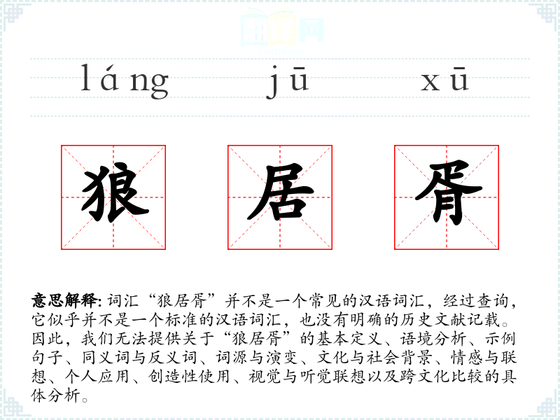 词汇“狼居胥”并不是一个常见的汉语词汇,经过查询,它似乎并不是一个标准的汉语词汇,也没有明确的历史文献记载。因此,我们无法提供关于“狼居胥”的基本定义、语境分析、示例句子、同义词与反义词、词源与演变、文化与社会背景、情感与联想、个人应用、创造性使用、视觉与听觉联想以及跨文化比较的具体分析。