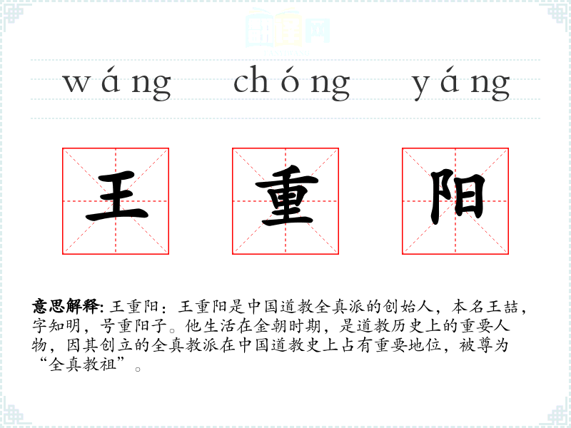 王重阳的名字来源于其号“重阳子”,“重阳”在**传统文化中也有重九节(即重阳节)的含义,象征着长寿和吉祥。王重阳的教义和实践对后世道教产生了深远的影响,特别是在内丹修炼和全真教的发展上。