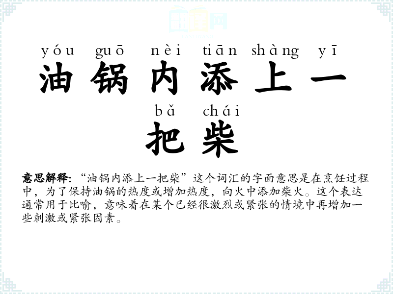 “油锅内添上一把柴”这个词汇的字面意思是在烹饪过程中,为了保持油锅的热度或增加热度,向火中添加柴火。这个表达通常用于比喻,意味着在某个已经很激烈或紧张的情境中再增加一些刺激或紧张因素。