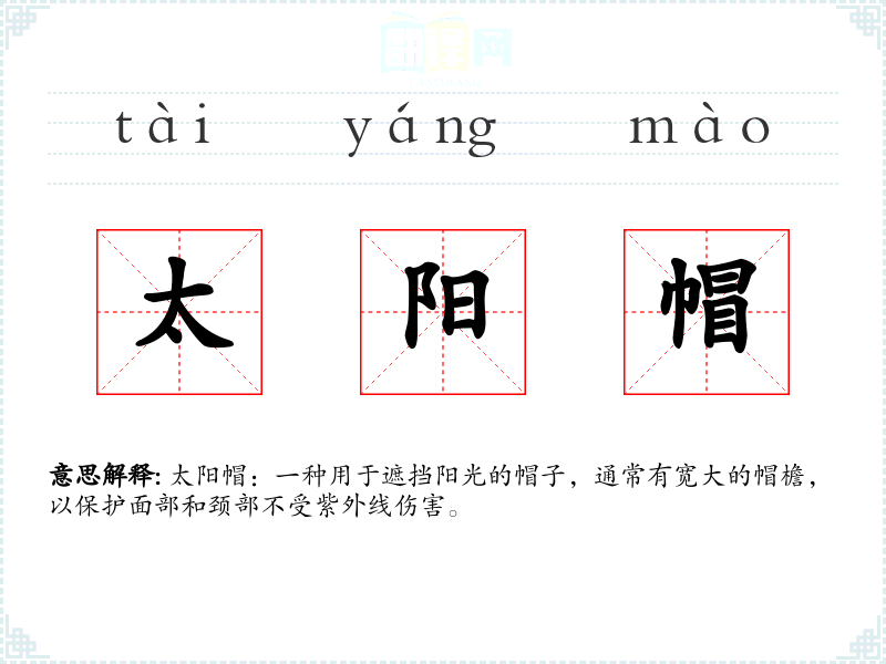 太阳帽:一种用于遮挡阳光的帽子,通常有宽大的帽檐,以保护面部和颈部不受紫外线伤害。