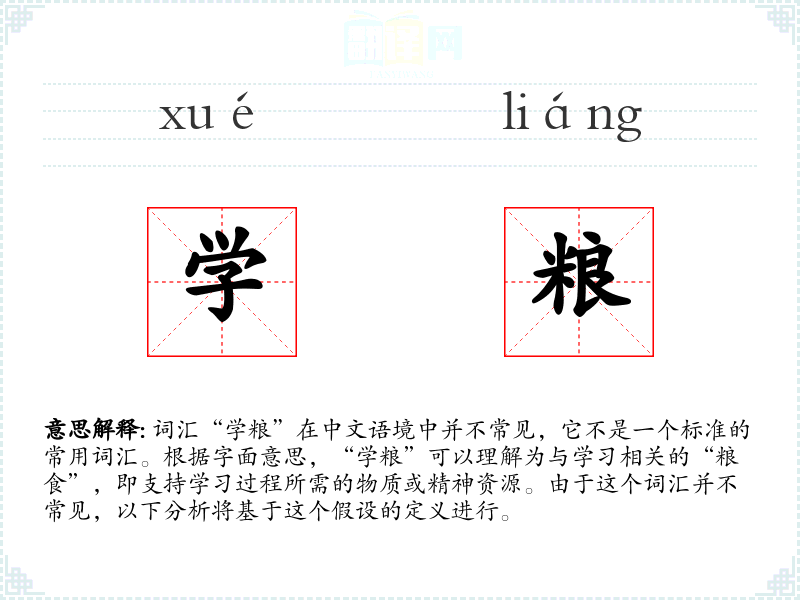 “学粮”字面意思是指学习的粮食,即支持学习活动的资源,包括书籍、资料、教育工具、学习环境等。