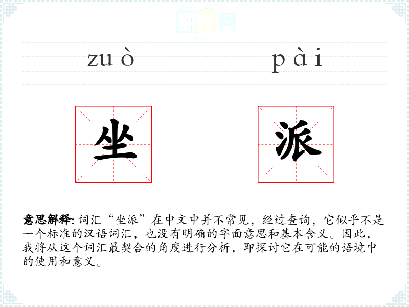 由于“坐派”不是一个标准词汇,我们无法给出确切的基本定义。它可能是某个方言词汇,或者是某个特定社群或网络用语中的创造性表达。