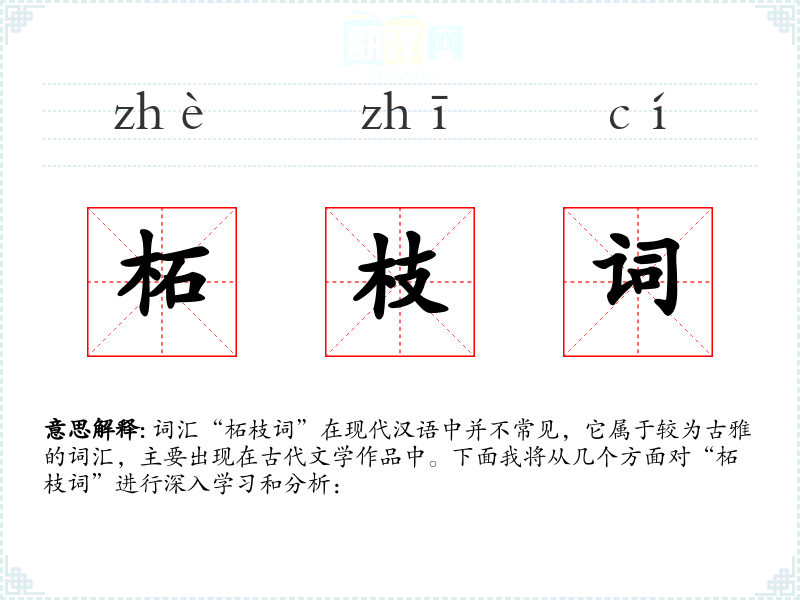 同义词:可能包括“柘树词”、“柘叶词”等,都是指与柘树相关的文学作品。 反义词:由于“柘枝词”是一个较为特定的词汇,反义词并不容易确定。
