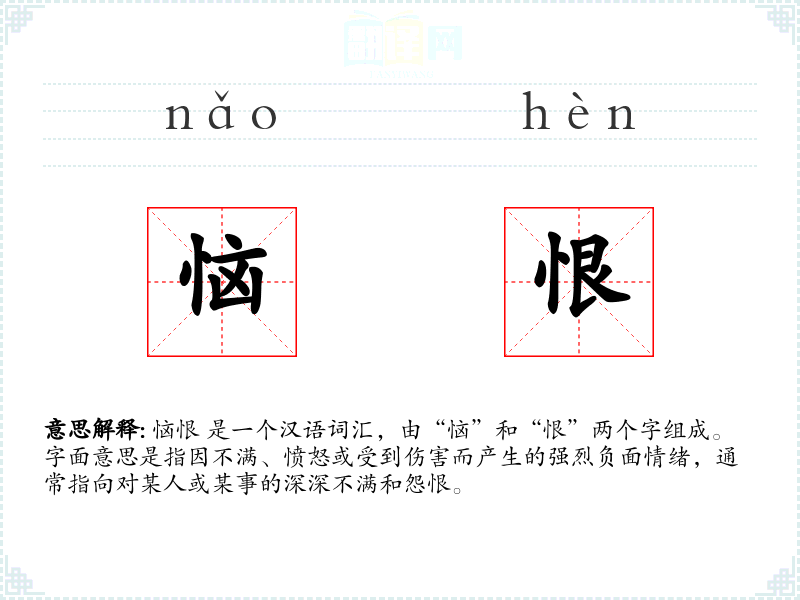 恼恨 是一个汉语词汇,由“恼”和“恨”两个字组成。字面意思是指因不满、愤怒或受到伤害而产生的强烈负面情绪,通常指向对某人或某事的深深不满和怨恨。