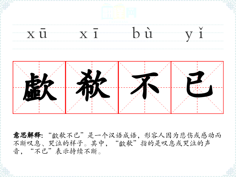 “歔欷”一词最早见于《诗经》,原意为叹息声,后来逐渐演变为形容哭泣的声音。“不已”则是一个常用词,表示动作或状态的持续不断。这个成语的形成和使用,反映了汉语中对于情感表达的细腻描绘。