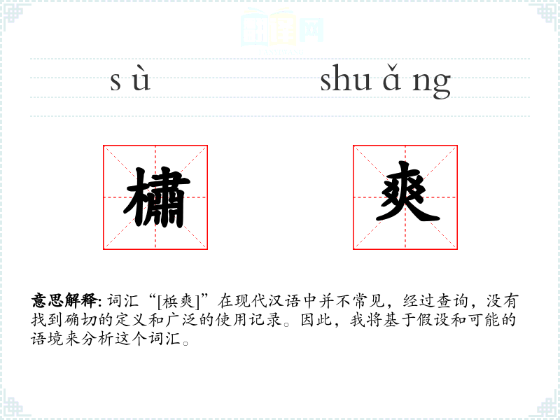 词汇“[梹爽]”在现代汉语中并不常见,经过查询,没有找到确切的定义和广泛的使用记录。因此,我将基于假设和可能的语境来分析这个词汇。