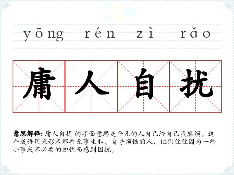 庸人自扰 的字面意思是平凡的人自己给自己找麻烦。这个成语用来形容那些无事生非、自寻烦恼的人,他们往往因为一些小事或不必要的担忧而感到困扰。