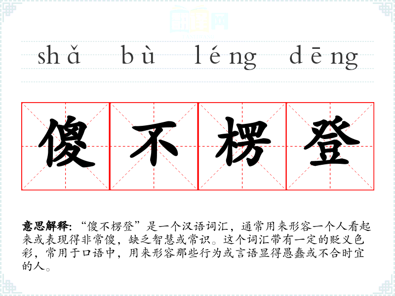 “傻不楞登”是一个汉语词汇,通常用来形容一个人看起来或表现得非常傻,缺乏智慧或常识。这个词汇带有一定的贬义色彩,常用于口语中,用来形容那些行为或言语显得愚蠢或不合时宜的人。