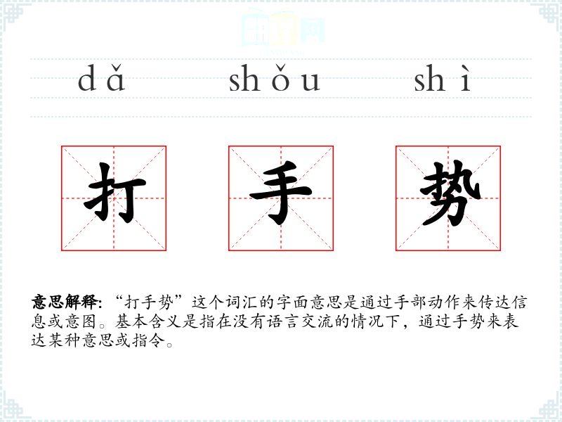 - 同义词:手势、示意、比划