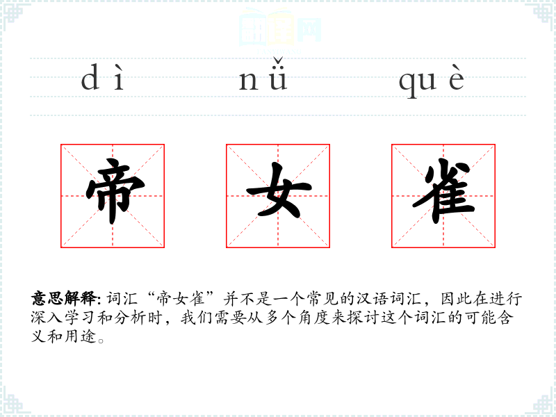 词汇“帝女雀”并不是一个常见的汉语词汇,因此在进行深入学*和分析时,我们需要从多个角度来探讨这个词汇的可能含义和用途。