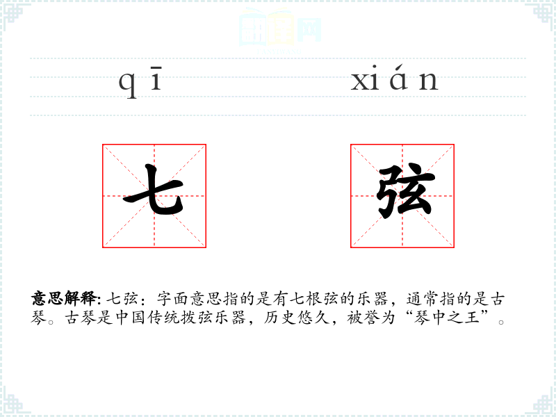 七弦:字面意思指的是有七根弦的乐器,通常指的是古琴。古琴是**传统拨弦乐器,历史悠久,被誉为“琴中之王”。