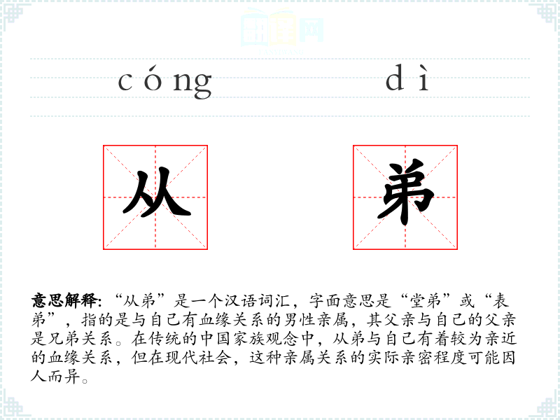 “从弟”一词源自古代汉语,其中的“从”字表示“跟随”或“附属”的意思,在这里指的是血缘上的附属关系。随着时间的推移,这个词汇的含义基本保持稳定,但在现代汉语中,使用频率可能有所下降,尤其是在城市化和家庭结构变化的背景下。
