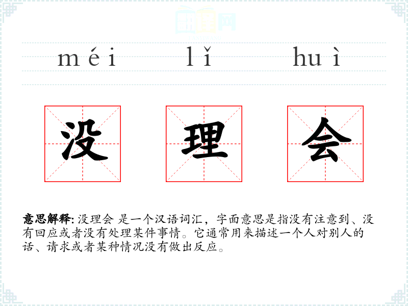 没理会 是一个汉语词汇,字面意思是指没有注意到、没有回应或者没有处理某件事情。它通常用来描述一个人对别人的话、请求或者某种情况没有做出反应。