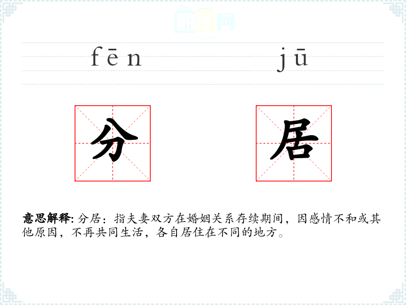 - 专业领域:在法律领域,分居可能涉及财产分割、子女抚养权等问题,如“在分居协议中,双方需明确财产分配和子女抚养的具体安排。”