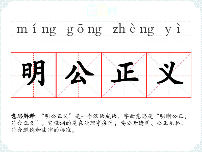 “明公正义”是一个汉语成语,字面意思是“明晰公正,符合正义”。它强调的是在处理事务时,要公开透明、公正无私,符合道德和法律的标准。