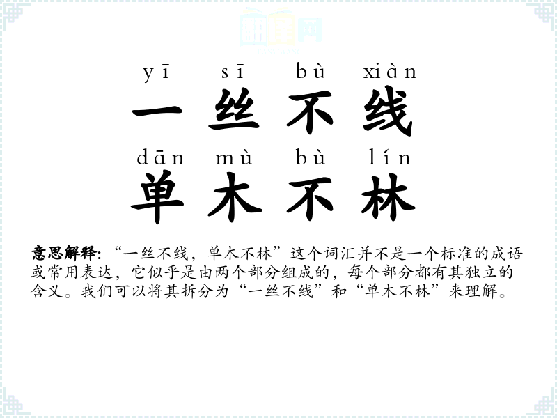 “一丝不线,单木不林”这个词汇并不是一个标准的成语或常用表达,它似乎是由两个部分组成的,每个部分都有其独立的含义。我们可以将其拆分为“一丝不线”和“单木不林”来理解。