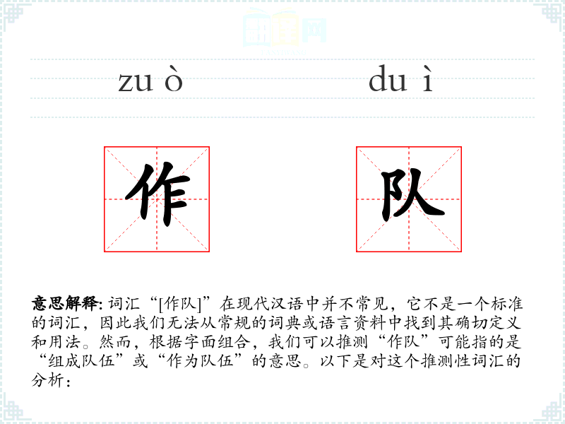 - 字面意思:由“作”和“队”两个字组成,“作”可以理解为“做”、“进行”或“组成”,“队”通常指“队伍”或“团队”。