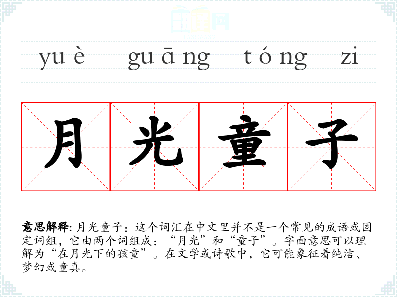 月光童子:这个词汇在中文里并不是一个常见的成语或固定词组,它由两个词组成:“月光”和“童子”。字面意思可以理解为“在月光下的孩童”。在文学或诗歌中,它可能象征着纯洁、梦幻或童真。