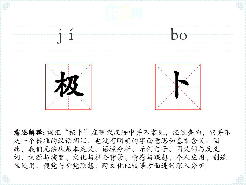 由于“极卜”不是一个标准的汉语词汇,我们无法提供相关的分析内容。如果你有其他词汇需要分析,请提供具体的词汇,我们将很乐意帮助你进行深入学习和分析。