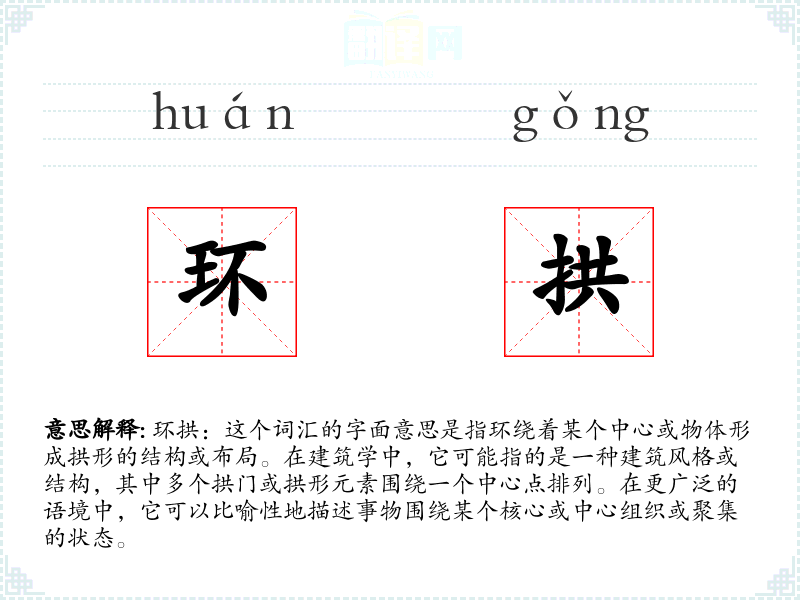 环拱:这个词汇的字面意思是指环绕着某个中心或物体形成拱形的结构或布局。在建筑学中,它可能指的是一种建筑风格或结构,其中多个拱门或拱形元素围绕一个中心点排列。在更广泛的语境中,它可以比喻性地描述事物围绕某个核心或中心组织或聚集的状态。