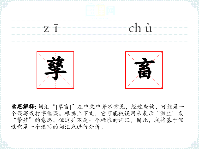 尽管“[孳畜]”不是一个标准词汇,通过对其组成部分“孳”和“畜”的分析,我们可以理解其在特定语境下的潜在意义。在语言学*和表达中,理解词汇的正确用法和语境是非常重要的。