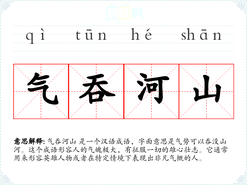 在文化中,山河常被视为国家的象征,因此“气吞河山”这个成语也体现了人对于英雄人物的崇拜和对强大力量的向往。在社会背景中,这个成语常被用来形容那些在政治、军事或商业领域中具有巨大影响力的人物。