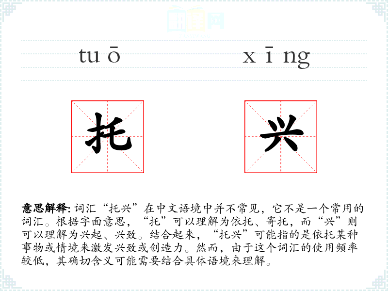 “托兴”的字面意思和基本含义可能是指通过依托某种外部条件或内在情感来激发创作灵感或兴致。