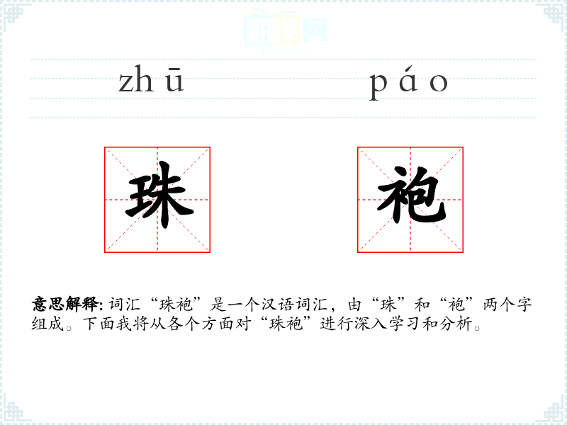 “珠袍”字面意思是由珍珠装饰的长袍。基本含义是指一种华丽的服饰,通常用于形容贵族或皇室成员的服装,因其装饰有珍珠而显得格外珍贵和华丽。