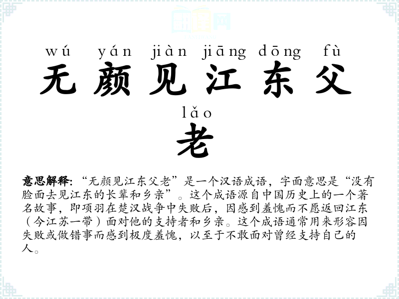 “无颜见江东父老”是一个汉语成语,字面意思是“没有脸面去见江东的长辈和乡亲”。这个成语源自**历史上的一个著名故事,即项羽在楚汉战争中失败后,因感到羞愧而不愿返回江东(今江苏一带)面对他的支持者和乡亲。这个成语通常用来形容因失败或做错事而感到极度羞愧,以至于不敢面对曾经支持自己的人。