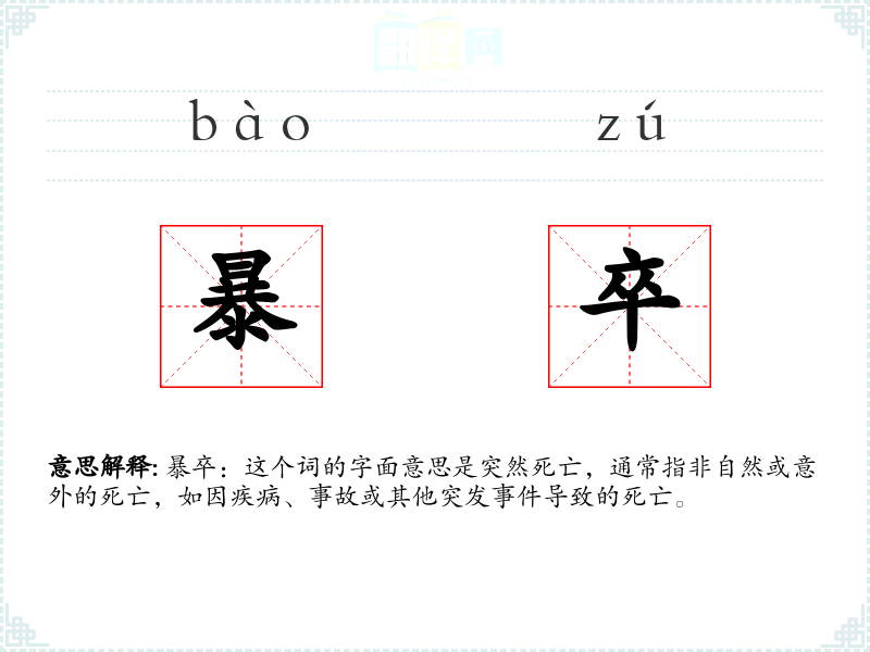 暴卒:这个词的字面意思是突然死亡,通常指非自然或意外的死亡,如因疾病、事故或其他突发**导致的死亡。
