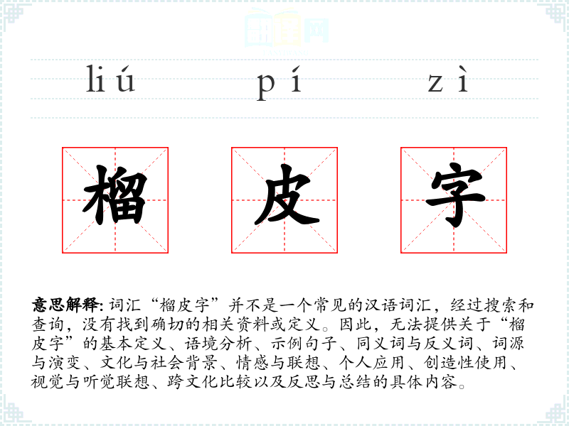 如果“榴皮字”是一个特定领域或方言中的词汇,可能需要更专业的资料或当地人的解释才能进行深入分析。如果这是一个打字错误或者是一个特定文化中的术语,建议提供更多的上下文信息以便进行准确的分析。