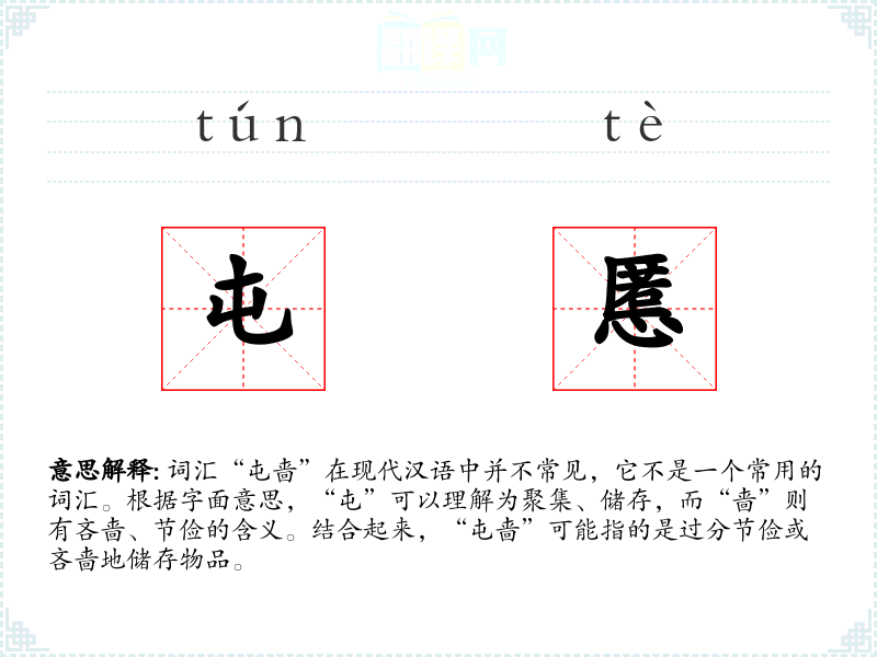 “屯”字在古代汉语中有聚集、储存的意思,如《说文解字》中解释为“聚也”。“啬”字则有吝啬、节俭的含义,如《说文解字》中解释为“爱濇也”。这两个字组合在一起,形成了“屯啬”这个词汇,但其使用频率较低,可能在古代文献中有所体现,但在现代汉语中不常见。