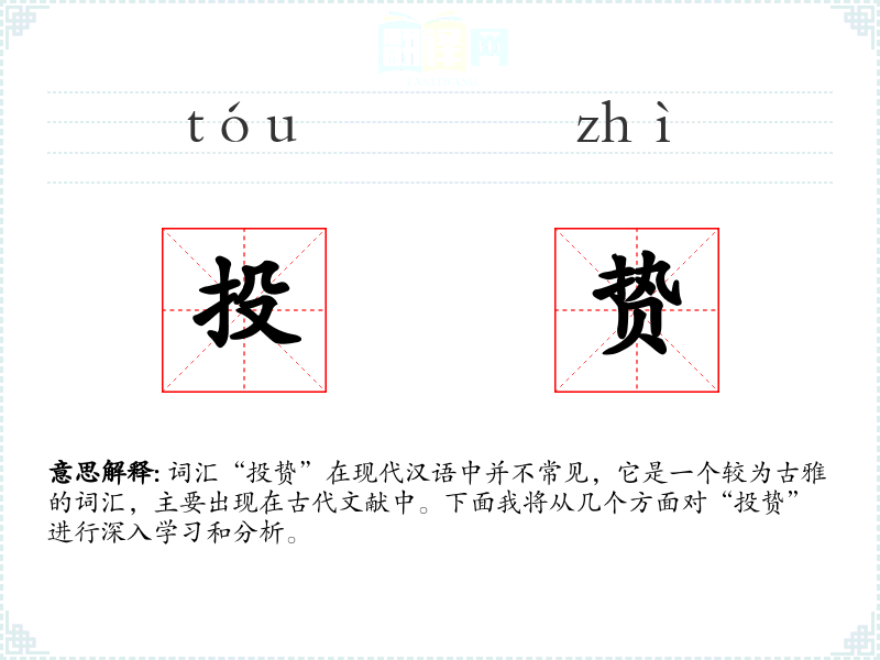 词汇“投贽”在现代汉语中并不常见,它是一个较为古雅的词汇,主要出现在古代文献中。下面我将从几个方面对“投贽”进行深入学*和分析。