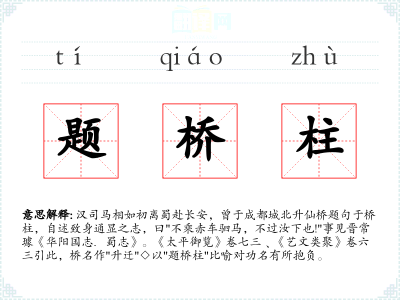 1.汉司马相如初离蜀赴长安,曾于成都城北升仙桥题句于桥柱,自述致身通显之志,曰"不乘赤车驷马,不过汝下也!"事见晋常璩《华阳国志.蜀志》。《太平御览》卷七三﹑《艺文类聚》卷六三引此,桥名作"升迁"◇以"题桥柱"比喻对功名有所抱负。