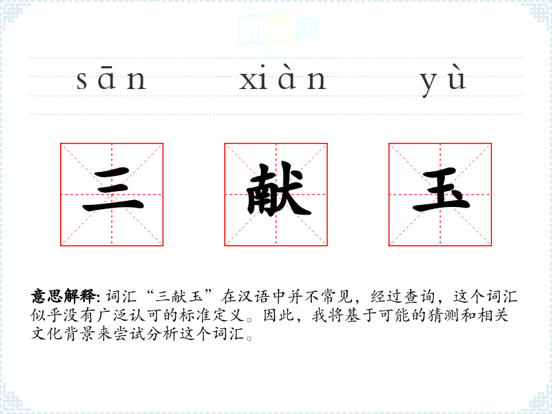 词汇“三献玉”在汉语中并不常见,经过查询,这个词汇似乎没有广泛认可的标准定义。因此,我将基于可能的猜测和相关文化背景来尝试分析这个词汇。