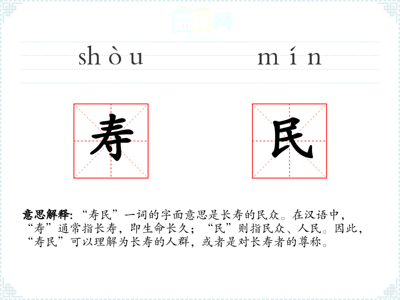 “寿民”一词的字面意思是长寿的民众。在汉语中,“寿”通常指长寿,即生命长久;“民”则指民众、人民。因此,“寿民”可以理解为长寿的人群,或者是对长寿者的尊称。