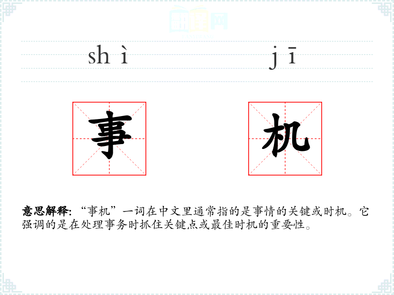 “事机”这个词对我来说是一个提醒,告诉我在生活中要善于抓住机会,尤其是在关键时刻做出正确的决策。在语言学*和表达中,理解并正确使用“事机”可以帮助我更准确地传达我的想法和决策。