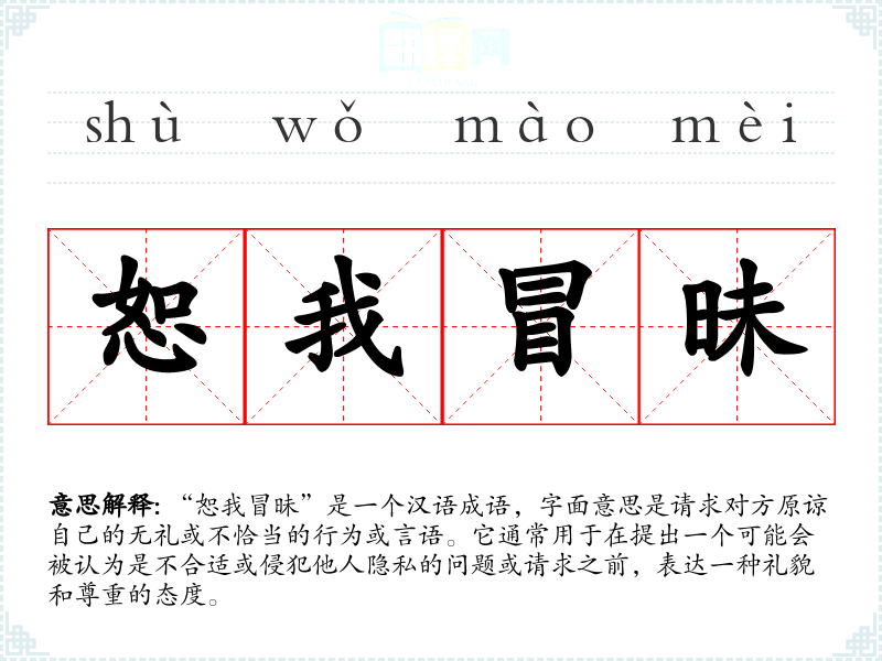 “恕我冒昧”是一个汉语成语,字面意思是请求对方原谅自己的无礼或不恰当的行为或言语。它通常用于在提出一个可能会被认为是不合适或侵犯他人隐私的问题或请求之前,表达一种礼貌和尊重的态度。
