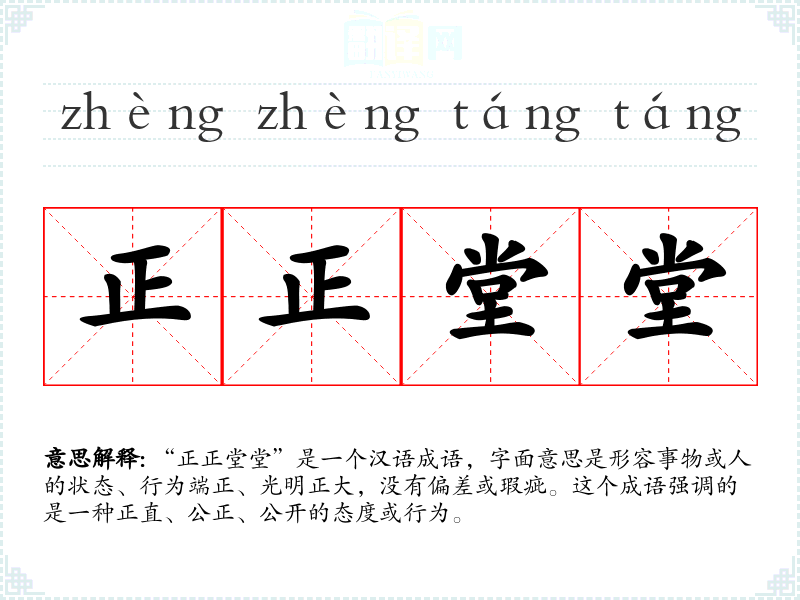 “正正堂堂”是一个汉语成语,字面意思是形容事物或人的状态、行为端正、光明正大,没有偏差或瑕疵。这个成语强调的是一种正直、公正、公开的态度或行为。